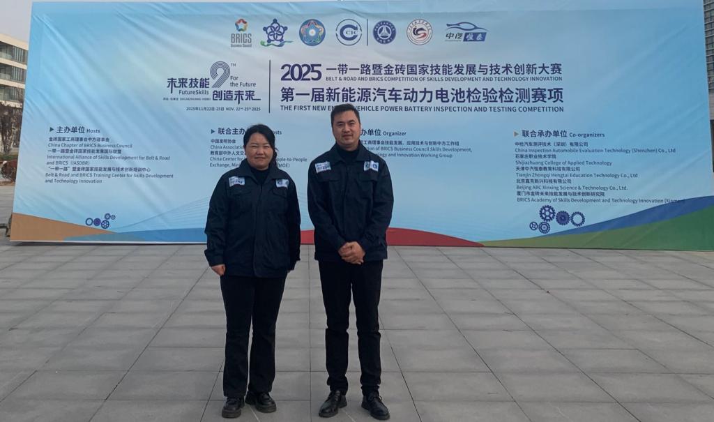 11月22日至26日,2025一带一路暨金砖国家技能大赛首届新能源汽车动力电池检验检测赛项全国总决赛在石家庄职业技术学院举行。汽车工程学院教师曹静、李世伟表现优异,荣获银奖。