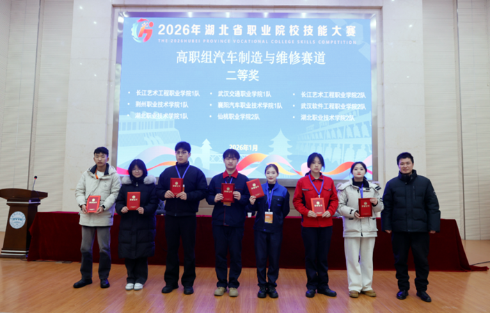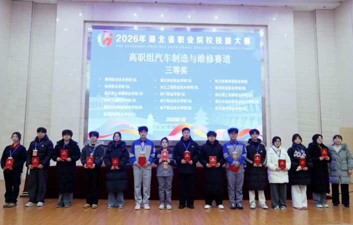 1月21日,2026年湖北省职业院校技能大赛(高职组) 汽车制造与维修赛道各项赛程圆满结束。闭幕式暨颁奖典礼在学校图书馆2号报告厅举行。