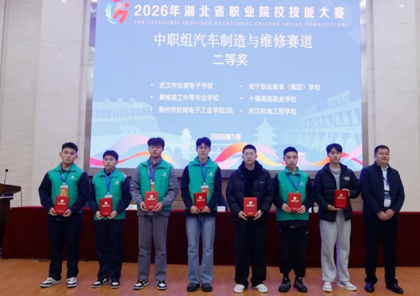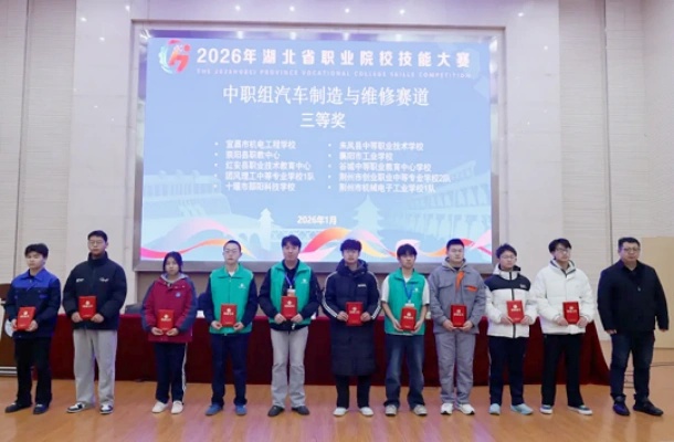 1月17日,2026年湖北省职业院校技能大赛汽车制造与维修赛道(中职组)闭幕式在我校图书馆二号报告厅举行。