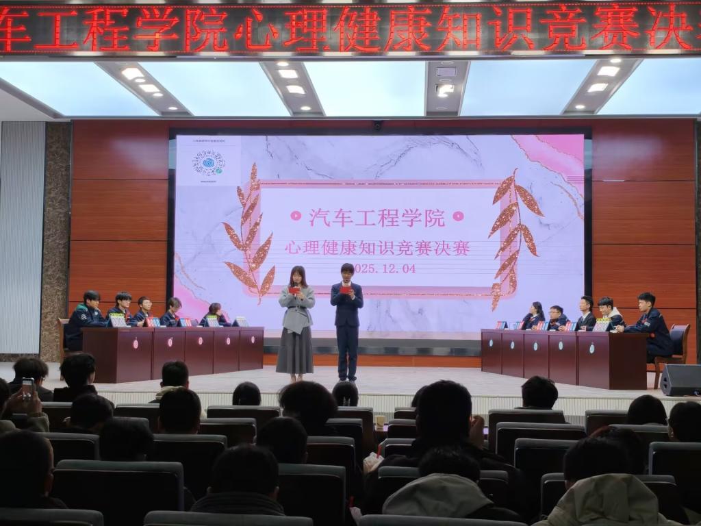 12月4日,汽车工程学院第八届心理健康知识竞赛决赛在智能制造大楼A栋四楼报告厅顺利举办。本次活动由学院二级心理工作站组织,以“知心践行・启智明心”为主题,通过以赛促学的方式普及心理健康知识,增强学生心理调适能力,培育理性平和的心态。经过11月26日初赛的纸质试卷考核,10位优秀选手晋级决赛。