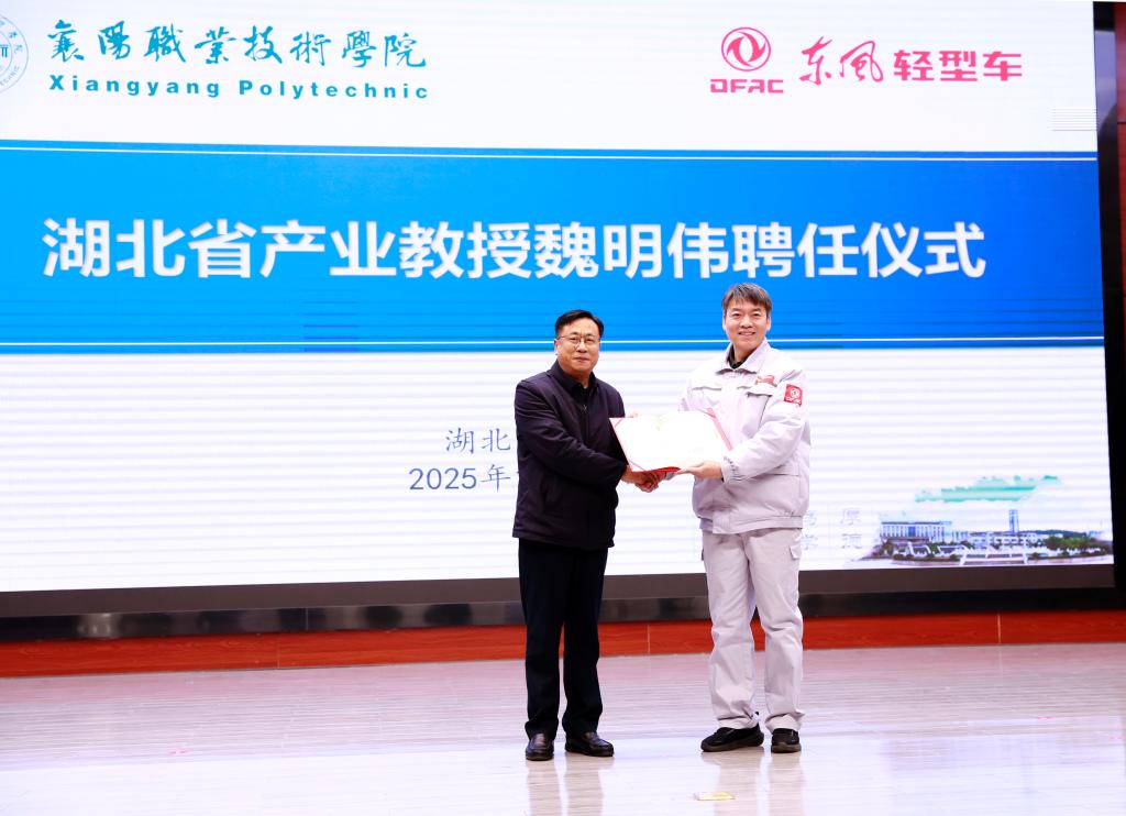 在随后举行的湖北省产业教授聘任仪式上,耿保荃为全国劳动模范、东风汽车股份襄阳工厂首席工种师魏明伟颁发聘书。据介绍,魏明伟作为企业高技术人才受聘为产业教授,将参与学校课程建设与人才培养,实现校企师资共享与双向赋能。